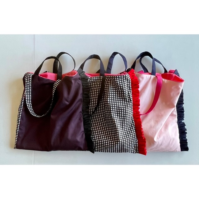 【もく夜モコ市・新品即納品】 もく夜モコ市は、 隔週木曜21時に登場する、 モコビンゴの「今すぐお届けできる」アイテムを集めた企画です。 ✍️このトートは即納品のため『ご購入前必読●納期短縮のコツ』の内容は対象外となります。 (あちらのページは通常オーダー商品に関するご案内のため) ■ トートの特徴 ・わざと端にずらした持ち手を握ると、立体的なシルエットが生まれます ・マチなしでもコロンと膨らむので、ポーチやお弁当などかさばるものも安心 ・ギチギチの短めフリルなので、ロマンチックになりすぎず、なのにボリューム満点 ■ 配色レシピ ひと足早く「うめ」な春をイメージして、 ほんのり渋めの明るい"うめピンク"を内側に忍ばせた春の3配色です。 春色だけど、まだ少しダーク味を残したこの時期仕様は、 即納品ならではです! ①黒ギンガム ・本体:黒白ギンガム ・片側フリル:赤 ・切替:赤 ・持ち手(長):黒 ・持ち手(短):ネイビー ・ウラ地:うめピンク ・内ポケット:ネイビー ②薄いピンク ・本体:薄いピンク ・片側フリル:ネイビー ・切替:ネイビー ・持ち手(長):濃いピンク ・持ち手(短):ネイビー ・ウラ地:うめピンク ・内ポケット:濃いピンク ③プラム ・本体:プラム ・片側フリル:黒 ・切替:黒白ギンガム ・持ち手(長):黒白ギンガム ・持ち手(短):黒 ・ウラ地:うめピンク ・内ポケット:赤 ※13枚目以降の写真は参考画像です --------------------------------- 素材 --------------------------------- 【外側】 程よくしっかりしたコットン100%オックス素材。 しなやかで丈夫。ボタンダウンシャツにも使われる 中厚でくったりした手触り◎ 【内側】 軽いけど丈夫なコットン100%シーチング素材です。 シーツなどにも使われる、さらっとしながらもたくましい生地。 どちらの素材も、お家でじゃぶじゃぶ洗えるのがうれしいポイントです。 --------------------------------- サイズ --------------------------------- A4サイズ、女性雑誌、ノートパソコン収納可。 ・本体:縦42cm×横42cm(フリル除く) ・フリル:4cm ・持ち手:長54cm、短28cm、幅2.5cm、持ち手間隔10cm ・内ポケット:縦14cm×横17cm ※一点一点ハンドメイドですので、ミリ単位の誤差はご容赦ください。 ※既製品にはないハンドメイドの風合いをお楽しみいただけると幸いです。 ※しっかり縫製していますが、あくまで布製です。 毎日ハードに使う方や、重たいものを日常的に運ばれる方には、よりタフな素材のバッグの方が安心かもしれません。 モコビンゴのバッグは、機能性より“ときめき”重視! 「これ持ってたら気分あがる~」って思っていただけるような、 お気に入りの“相棒”として楽しんでいただけたらうれしいです。 ■ 発送 ご決済確認後、3日以内にクリックポスト(追跡あり・ポスト投函)にて発送いたします。 発送完了メールには【追跡番号】を記載いたします。 ■ 返品・交換 万一、当方の不備があった場合は誠意をもって対応いたしますが、 お客様都合による返品はご遠慮いただいております。 あらかじめご了承ください。 ■ お問い合わせ ご質問などのお問い合わせは事前にいただくか、 もしくは公開翌日の朝以降に順次お返事いたします。 リアルタイムでの即レス対応はできかねますので、どうかご了承くださいませ◎