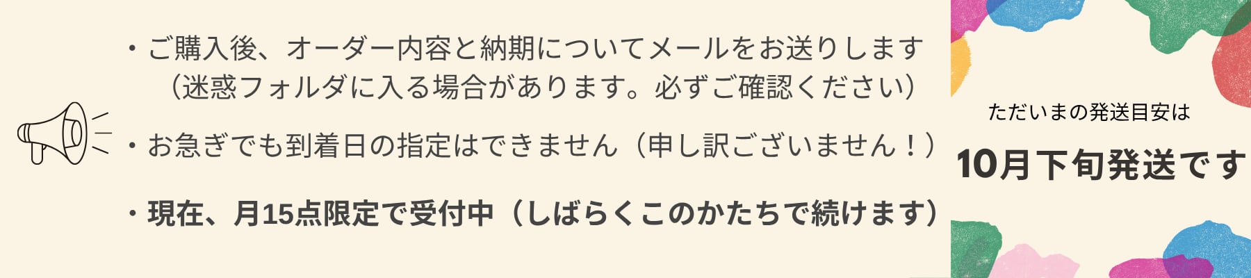/ しましまとフリルのハイブリッド \ たっぷり面積を取ったしましま部分は、 ・きんちゃくを絞ればフリル ・絞らなければフタにもなります◎ 太め(約4cm)間隔のしましま素材になかなか出会えないので …ならば作ろう! と、しましまのプリント生地ではなく、自作で、しましまも作っています。 そのため、この作品もお好みのカラーリングで配色オーダーが可能です♪ モード系、POP系、モノトーン系・・ どんなテイストもかわいくまとまるデザインになりました。 --------------------------------- 配色オーダー --------------------------------- いっしょにつくってみませんか! 自分だけのオーダーカラーで愛着増し増し! お好きなカラーのリクエストでもお作りします (アップ料金はございません◎) 「オーダー見本」を参考に、 備考欄にすべてのパーツの色を記入してください。 決めきれない部分は「おまかせ」でもOKです。 【オーダー見本】 外側カラー 本体…きなり 斜めがけ…赤 内側カラー しましま…きなり×赤 ※選択肢は内側用です、ご注意ください ウラ地…赤 内ポケット…きなり ※巾着のヒモは、きなりか黒です。 本体カラーにあわせて適宜こちらで選びますが、 ご希望があればあわせてご記入ください。 ※ 外側用と内側用で『色の選択肢が異なり』ます。 ■ 外側カラー(本体・斜めがけ・しま部分の土台) きなり/きいろ/マスタード/くすみレモン/薄いピンク/ 濃いピンク/赤/オレンジ/水色/青/ネイビー/プラム/ 薄いグレー(※)/濃いグレー/ミント/みどり/黒ギンガム/ 赤ギンガム/カーキベージュ/黒(※) 素材:オックス(※ツイル) ■ 内側カラー(しま部分のしましま・ウラ地・内ポケット) ねずみ/ベージュ/ミント/きいろ/薄ピンク/うめピンク/ 濃ピンク(※)/赤/びわ/グレープ/濃水色/青/深緑/ ネイビー/黒/きなり(カス残し)/白黒・大粒ドット(※) 素材:シーチング(※ブロード) 迷った場合は ・配色ギャラリー https://mocobingo.theshop.jp/p/00004 ・最新事例 Instagram → @mocobiiiingo ・実物でじっくり検討「色見本帳」 https://mocobingo.theshop.jp/items/108828217 ■本体が撥水タイプのお申し込みはこちらのページからどうぞ https://mocobingo.theshop.jp/items/74866947 --------------------------------- 素材 --------------------------------- 程よくしっかりしたコットン100%オックス素材です。 そもそもオックスとは、 しっかりと丈夫、だけど厚手のゴワゴワというものではなく、 しなやかな強度のある生地です。 (イメージとしてはボタンダウンシャツでよく使用されています!) のりの効いた帆布のガッシリではなく、くったり。 ペラペラの薄手生地ではなく、中厚。 荷物が多くなりがちな方でも安心感があります。 ●黒生地だけは、こだわっています! ホコリ・シワが気にならない綿+ポリエステル混の素材 ポリエステル65%、コットン35% 黒の生地はホコリが目立って気になるので、、 ポリエステル混にしました。 いずれも、 お家でじゃぶじゃぶ洗えるのがうれしい生地で大好きです。 ●裏地も綿100%の薄い生地(シーチング)なので、気軽にお洗濯OKです。 ●くったりとやわらかいので自立はしません --------------------------------- サイズ --------------------------------- スマホ、ハンカチ、お化粧ポーチ、軽いはおりもの、モバイルバッテリー、エコバッグ、長財布、ペットボトル… などなど、お出かけグッズ一通りはまるまるOKです。 フタの巾着を縛らなければB5も入ります。 さらに 小物の行方不明を撲滅すべく、ストレスフリーな内ポケットつき。 ・本体…縦26cm×横36cm ・マチ…縦16×横20cm ・斜めがけ…63~117cm・幅2cm・長さ調整のスライダー付き ・内ポケット…縦14cm×横17cm ※一点一点ハンドメイドですので、ミリ単位の誤差はご容赦ください。 ※量産品にはないハンドメイドの風合いをお楽しみいただけると幸いです。 --------------------------------- オプション(有料) --------------------------------- ・内ポケットの追加 ・斜めがけの金具を取り外し可能に差し替え その他・詳しくは サイズ変更・パーツ追加オプション https://mocobingo.theshop.jp/p/00006 --------------------------------- オプション(無料) --------------------------------- ・しましま部分の色選択 標準では、薄い素材の「内側カラー」から選んでいただきますが、 きんちゃくにしたときに少しゴワっとしてOKであれば、 「外側カラー」からの選択もOKです。 ●トートに込めた小さな思いを、標語にしてみました。 今日の帰り道や寄り道も、トートと一緒に楽しく安心気分で歩けますように 作品ごとにモコ標語はランダムに変わるので、あわせてお楽しみください♪ ==今日もトートと行きはよいよい帰りもよいよい==