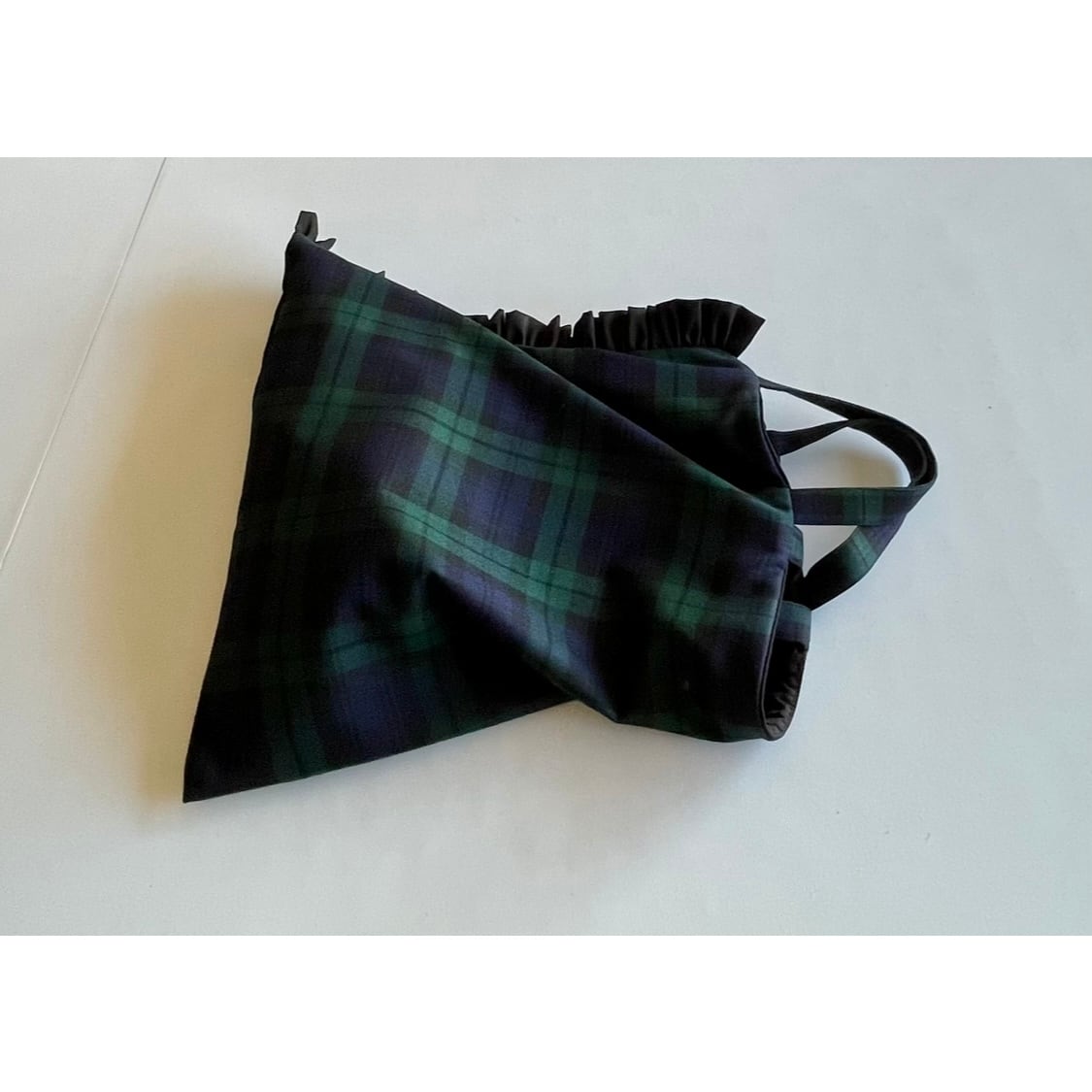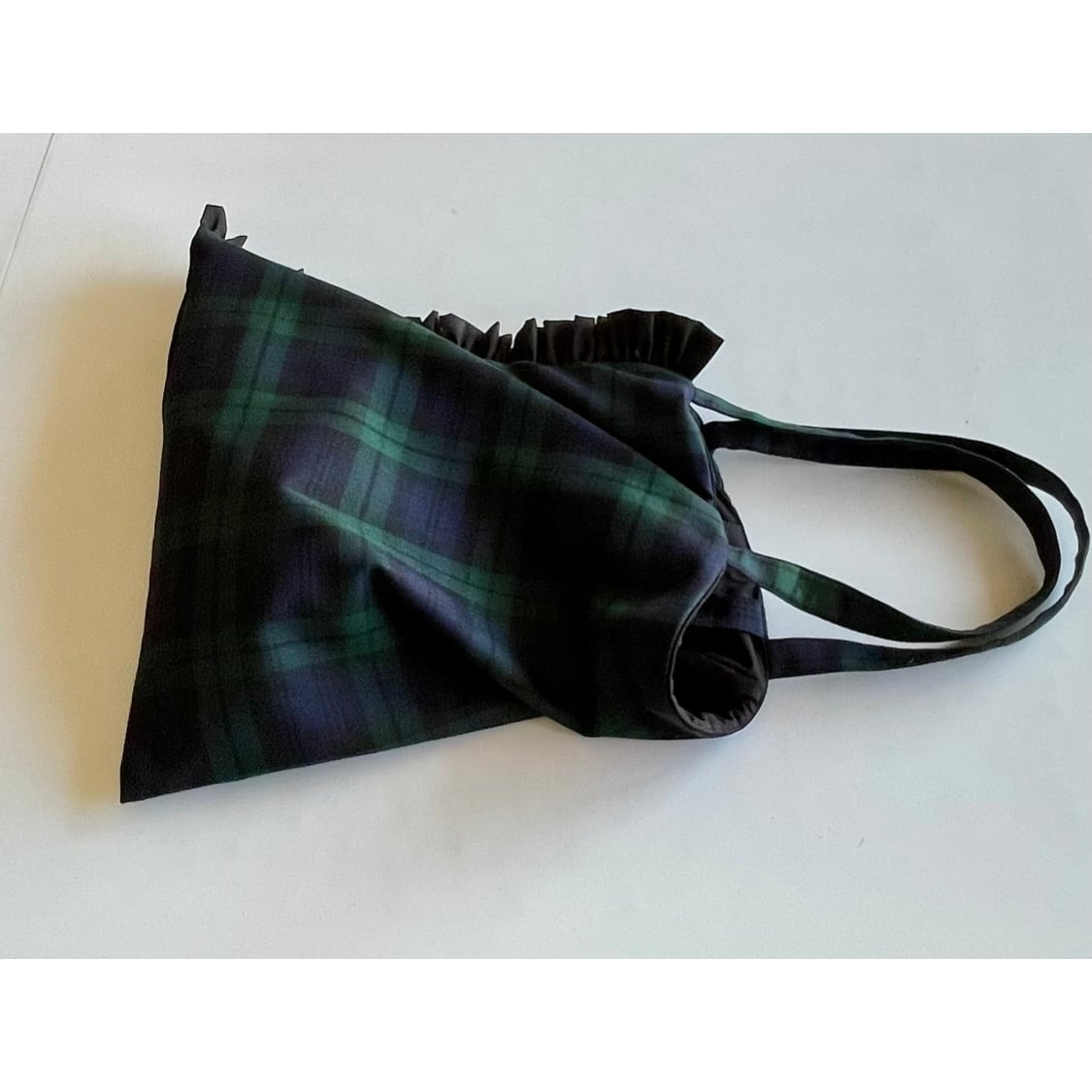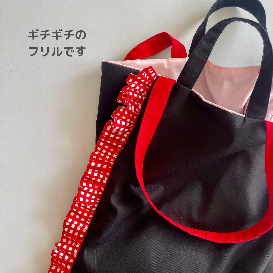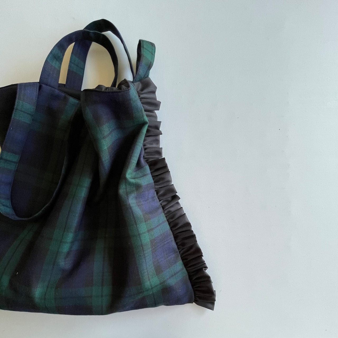 【モコ市販売】ズレズレ持ち手の 2way やわらか トートバッグ タータンチェック+片側フリル