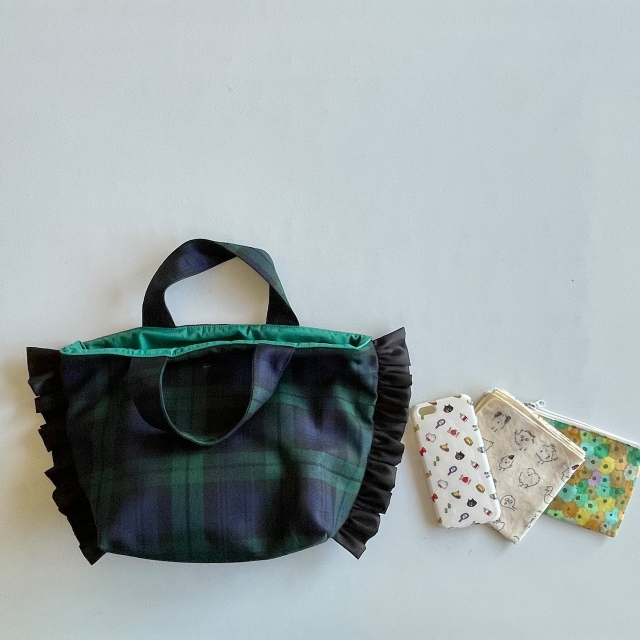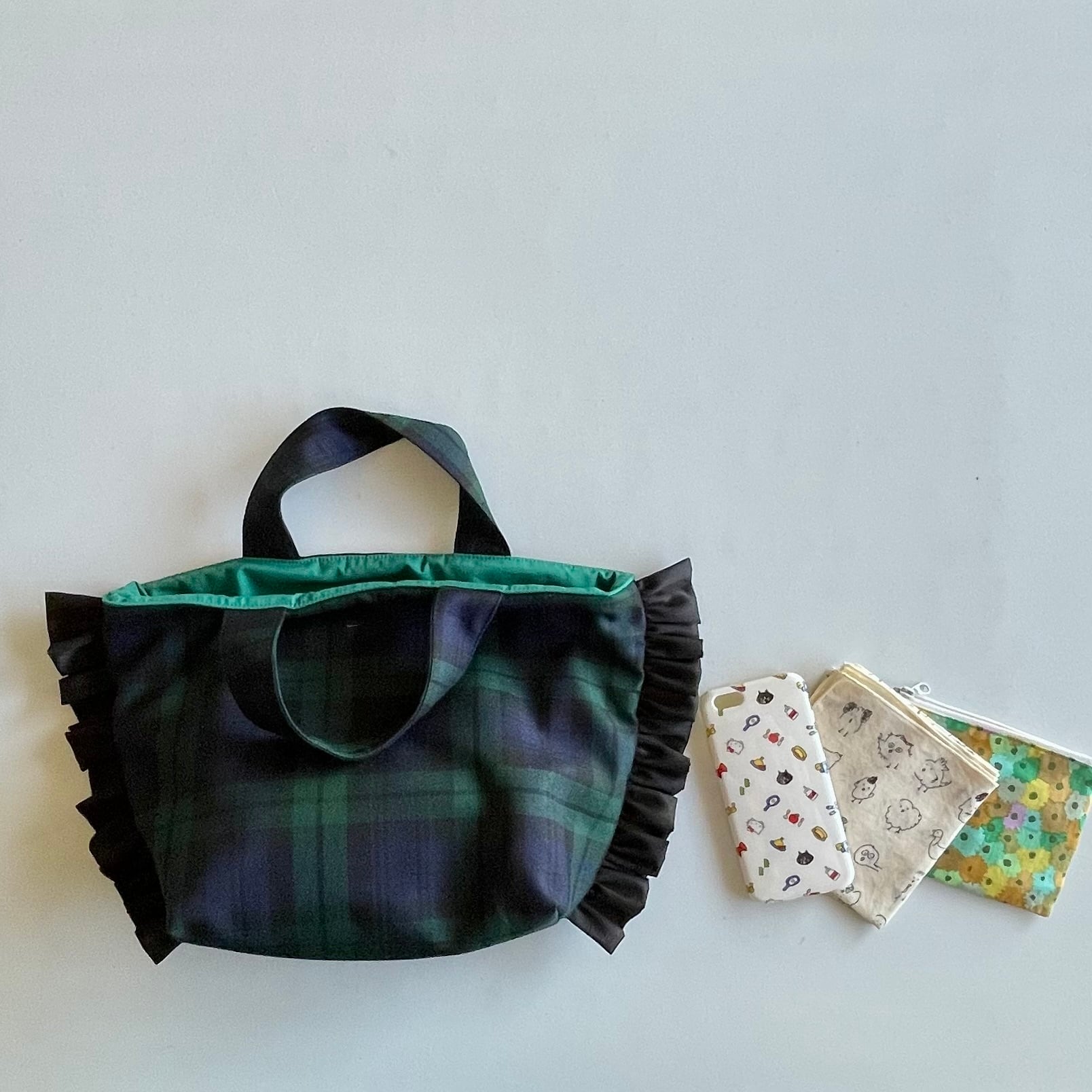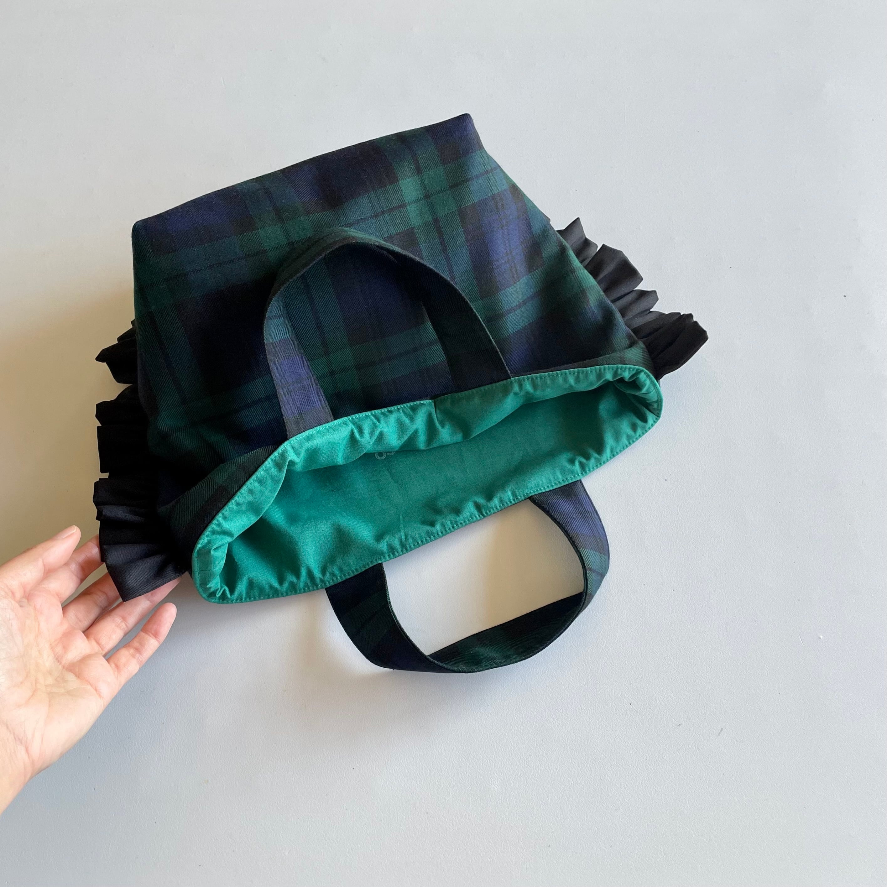 【モコ市販売】四角い マチ つき フリルトートバッグ Sサイズ やわらかタータンチェック
