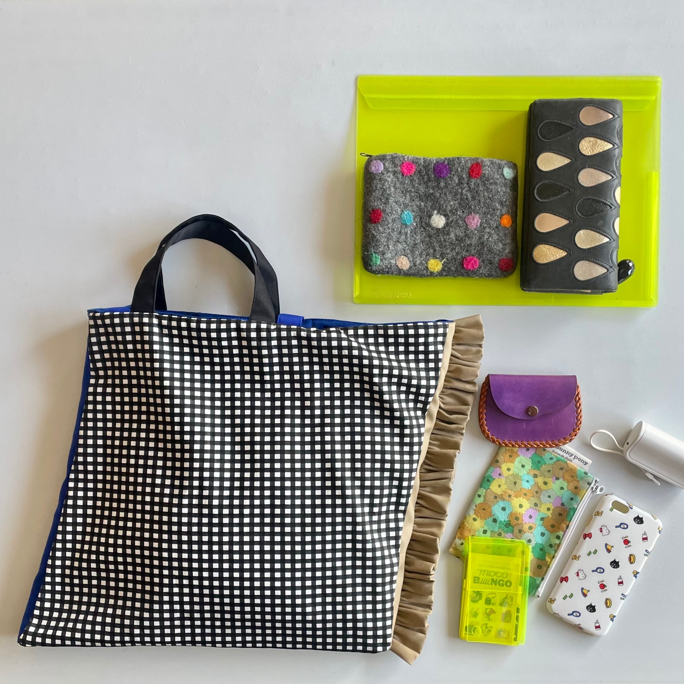 持ち手(黒白ギンガム、黒)、ウラ地(ベージュ)、内ポケット(深緑)
