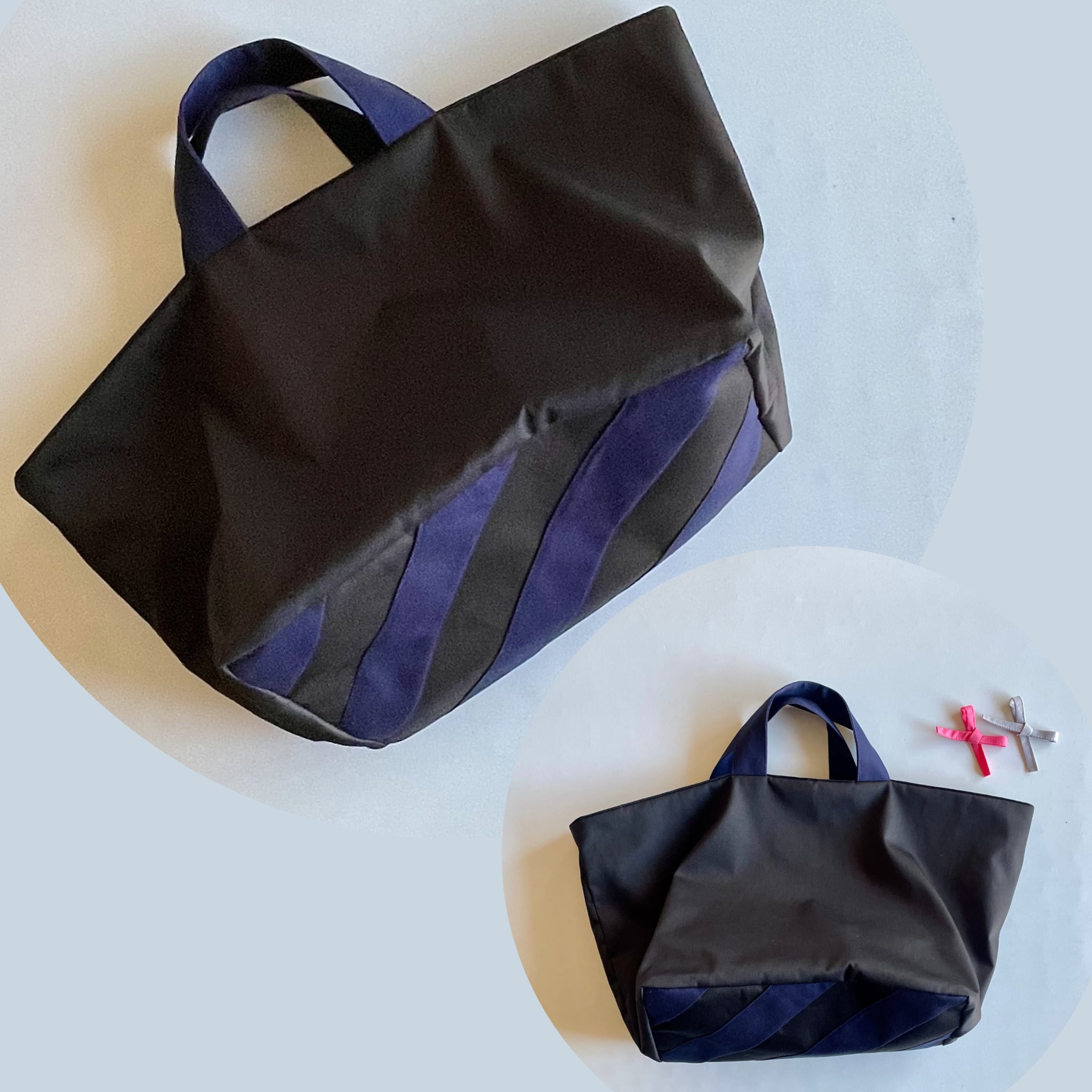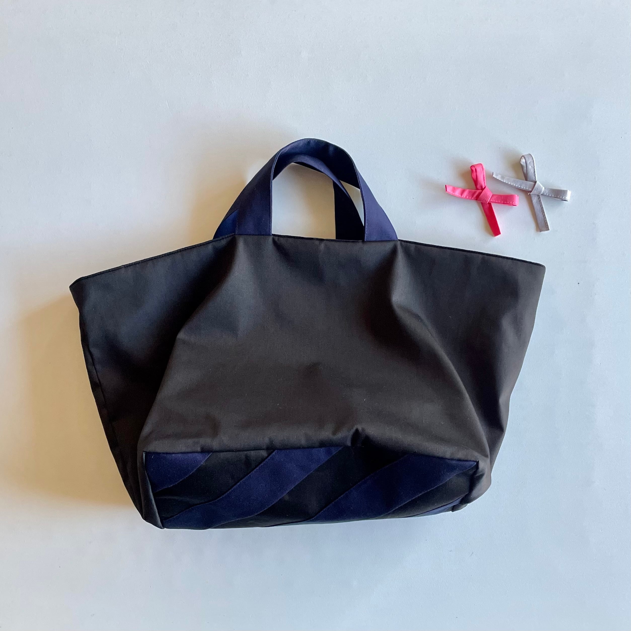 持ち手(ネイビー)、ウラ地(黒)、内ポケット(ねずみ)