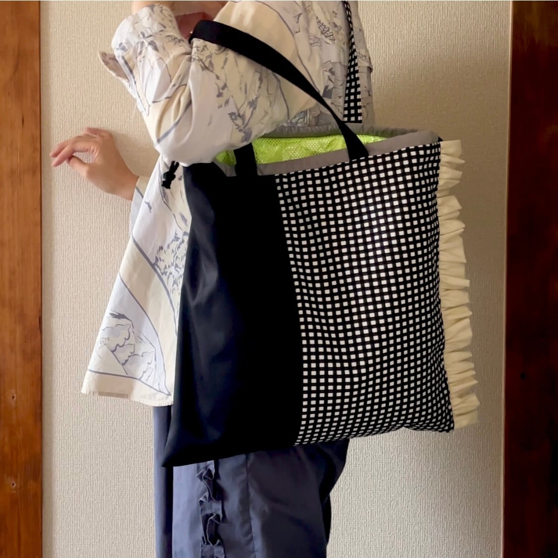 【即納モコ市】\実は保冷温/3枚パネルの 2way フリル トートバッグ(コットン+アルミシート)