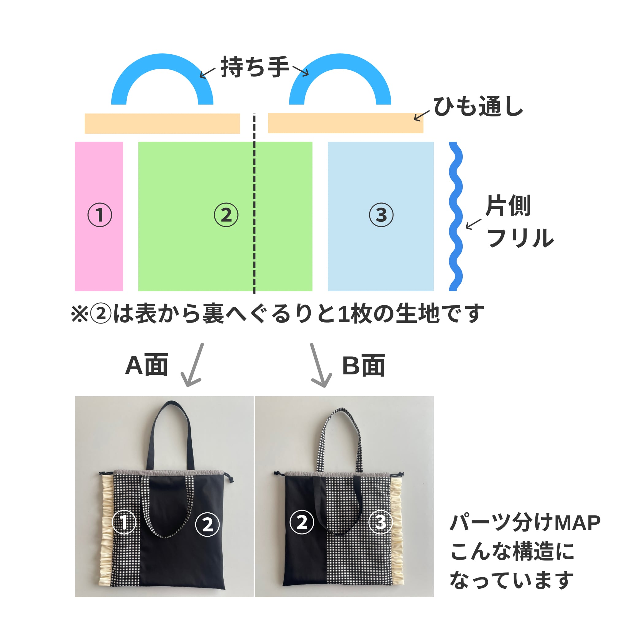 ・A/B面で配色の面積が違うのでリバーシブルに楽める