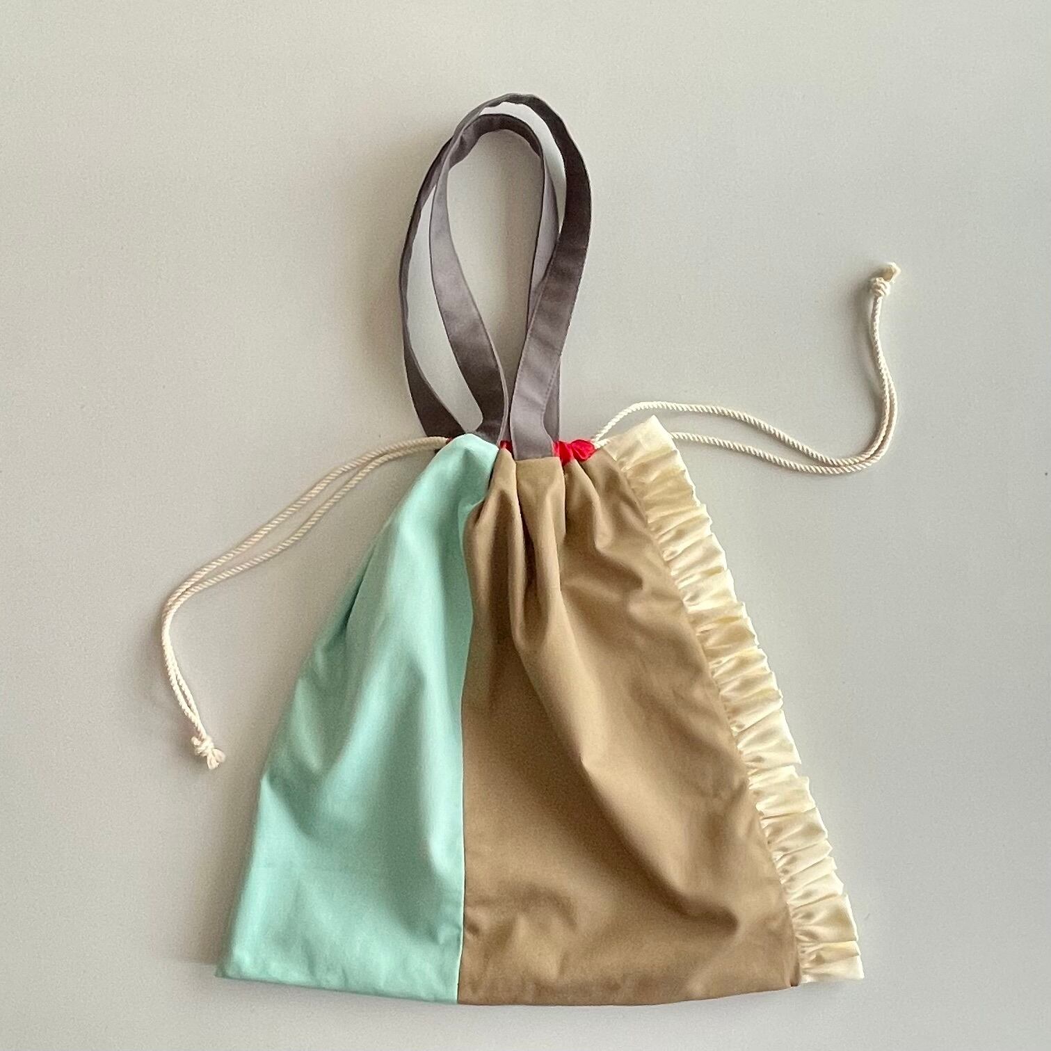 きんちゃくを絞ると三角おにぎりシルエットに。